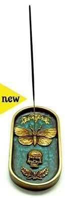 真鍮色の死蛾のデザインが施されたポリストーン製の線香皿。寸法は 4.5 インチ x 8 インチ。